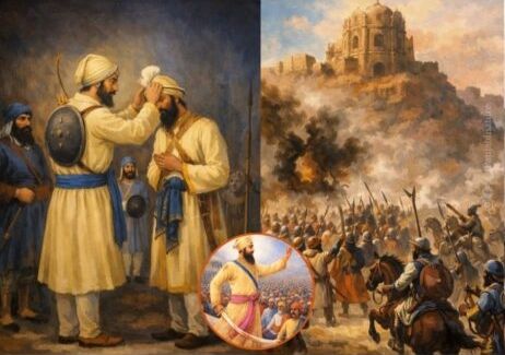 During the fierce battle fought at the Kachi Garhi of Chamkaur, Guru Gobind Singh Ji and a small group of Sikhs faced a massive Mughal army said to be in lakhs. To ensure the safety of Guru Sahib and to mislead the enemy, Bhai Sangat Singh Ji demonstrated supreme devotion by donning the Guru’s kalgi and attire. Standing as a symbolic shield for the Khalsa Panth, he willingly embraced martyrdom while displaying extraordinary courage and unwavering faith.